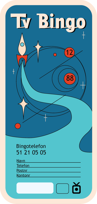 Tv bingo is a television show where you play bingo. Using the whimsical and optimistic aestethic of 60s futurism, I've made the brand fun and exiting. Like bingo should feel like!