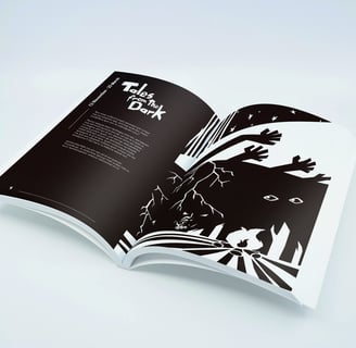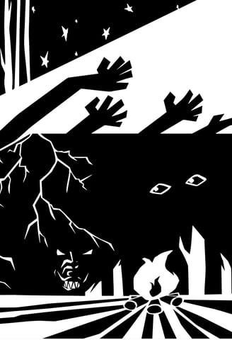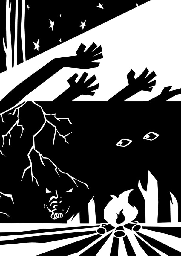 I created a visual style that reminisens of woodblock printing and shadow theater. The use of these visuals is to symbolize how old fairy tales really are. Using only black and white demands attention. Our vision can only see in grays during night, if you can see at all. As you know, the night are when monsters appear.