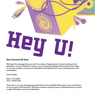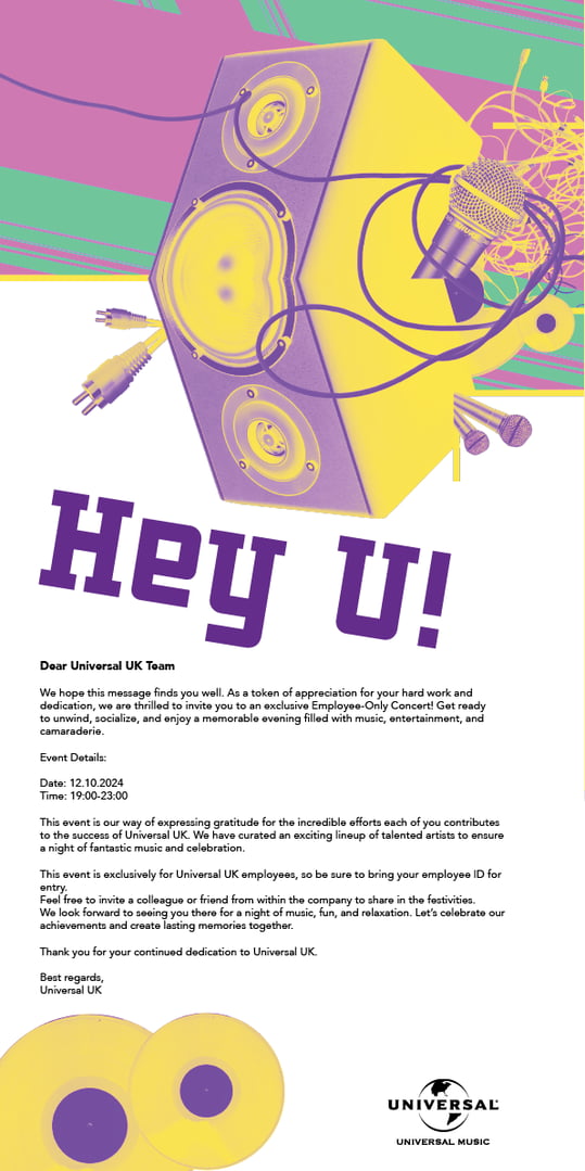 Every year, Universal music UK, makes a concert for their employees to show admiration for the work they're doing. All the artists are from universal music, but you don't know who it is that shows up. To advertise this concert you can't therefore use artists.